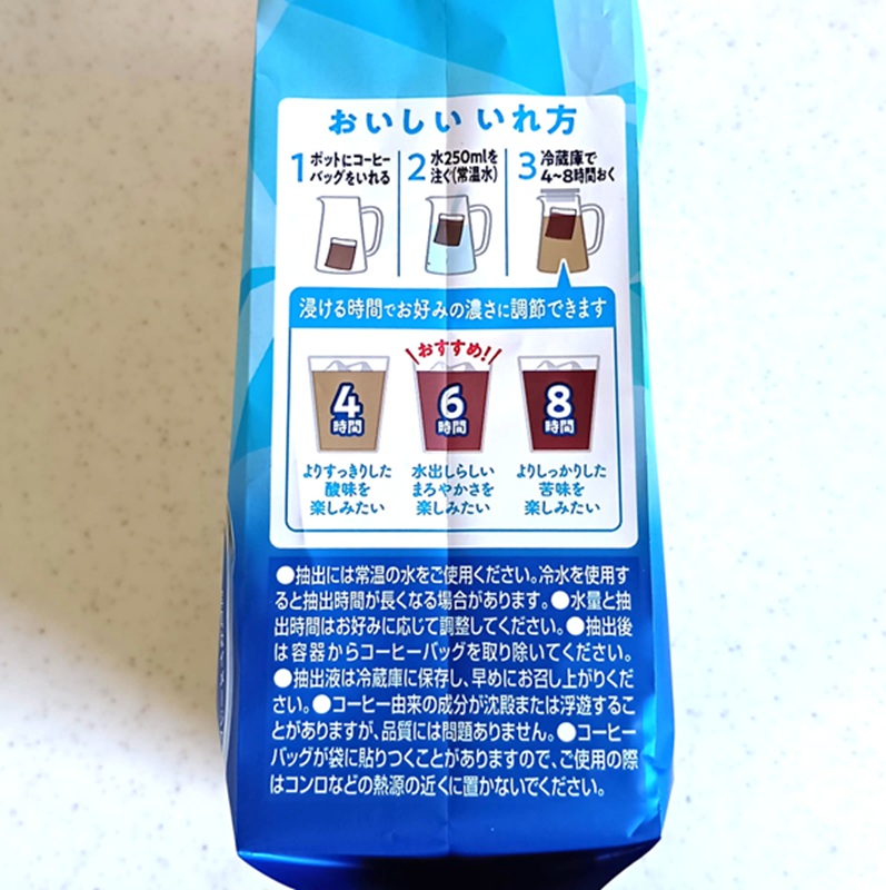 今回ご紹介するコーヒーバッグタイプは、抽出には時間がかかるものの、容器に入れて水を注いで冷蔵庫に入れておくだけと手間いらず。