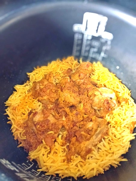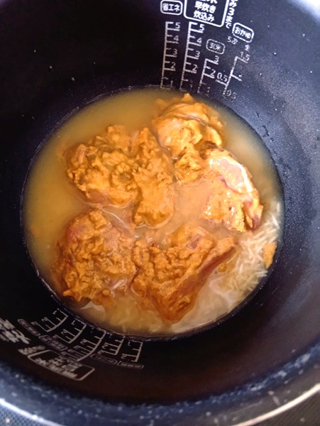 30分経ったらお肉を漬けだれごと放り込んで普通に炊飯。