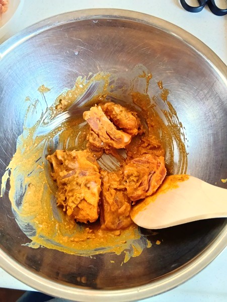 お次に、スパイスと、ケチャップ、ヨーグルト、おろししょうが、にんにく、塩、フライドオニオンを鶏もも肉に絡めます。