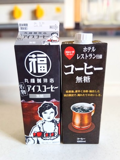 今回は、スーパーで買える丸福珈琲店のアイスコーヒーと、スジャータめいらくのアイスコーヒーを飲み比べてみました。